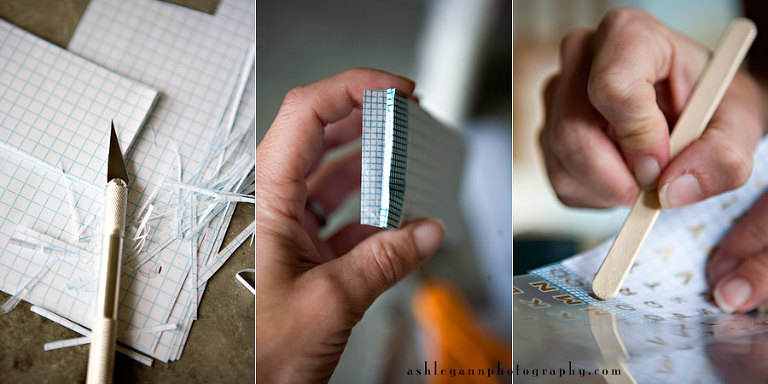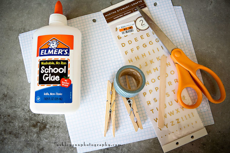 Supplies: Graph paper, glue, masking tape (the cuter the better), exacto knife, scissors, rub on stickers, clothepins