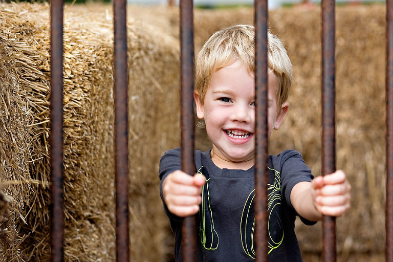 Photo Tip: I gathered from my Hawaii photo tips that you all like to see mistakes. Well I don’t mind showing them. Here Big Brother is in ‘jail’ at the pumpkin patch. What is something very simple that could have been done to improve this picture?