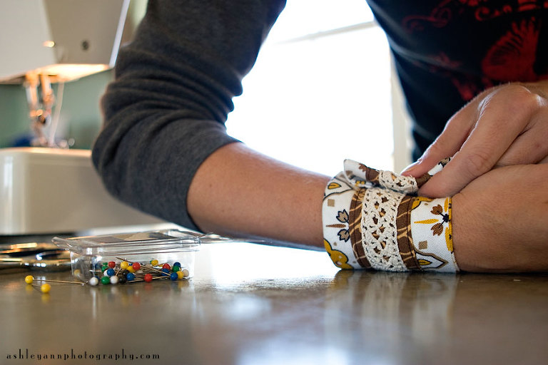 Since I was going to be on stage in front of 2500+ women I thought it was a good excuse to go get a new outfit…or at least a top. However, I always have a 1 and 2 year old with me. Trying on clothes with those two is basically impossible. I tried working out at time to go shopping with Chris’ schedule, but he worked late nights and stores were closed by the time I could have gone. Since shopping wasn’t in my future I decided to take advantage of nap times and make myself a new accessory to wear with an old outfit….I made a cuff….also known as a wide fabric bracelet.